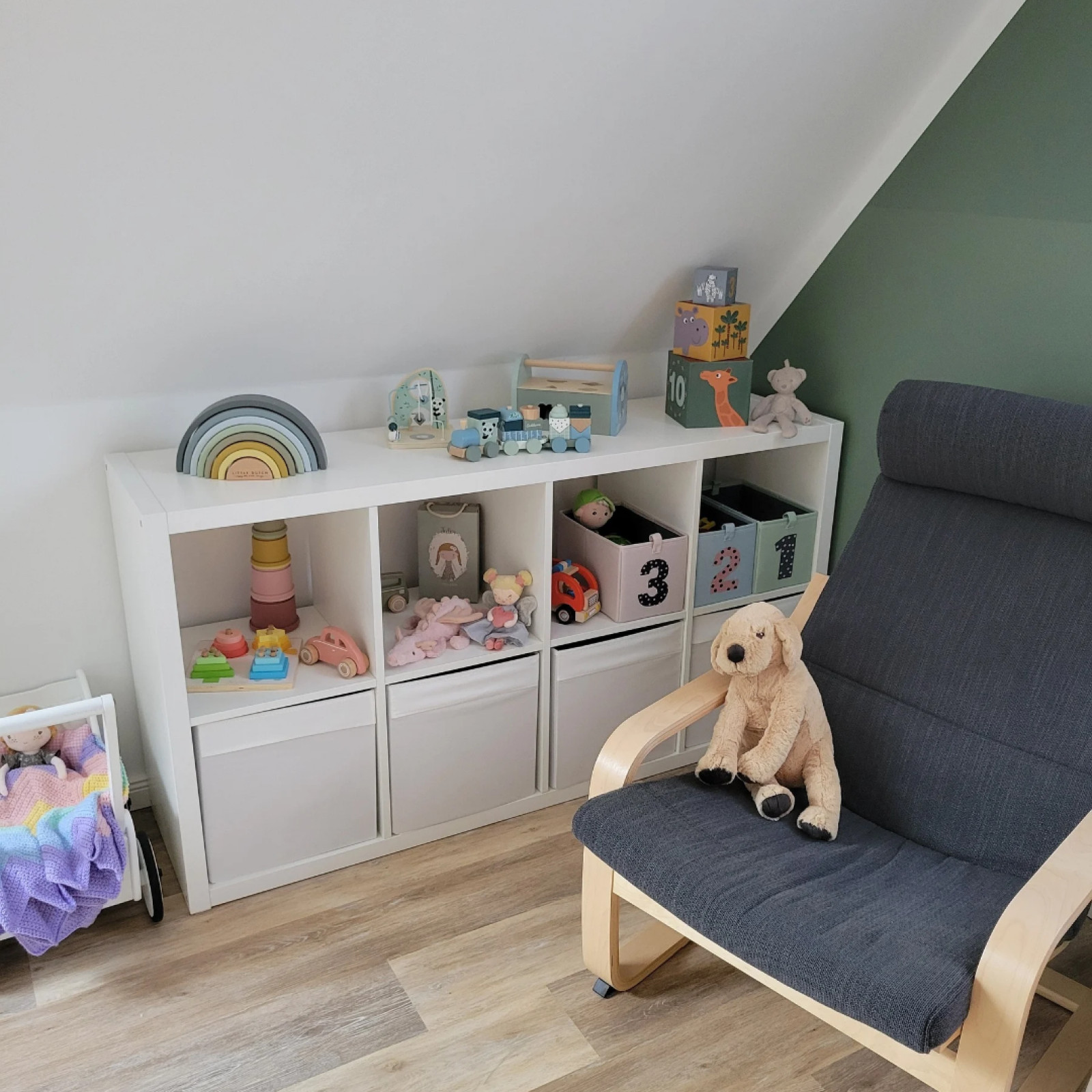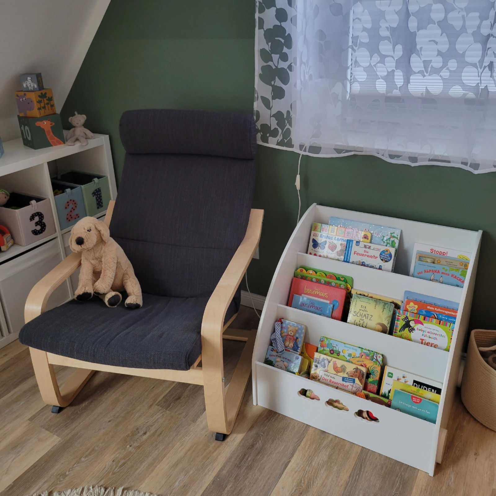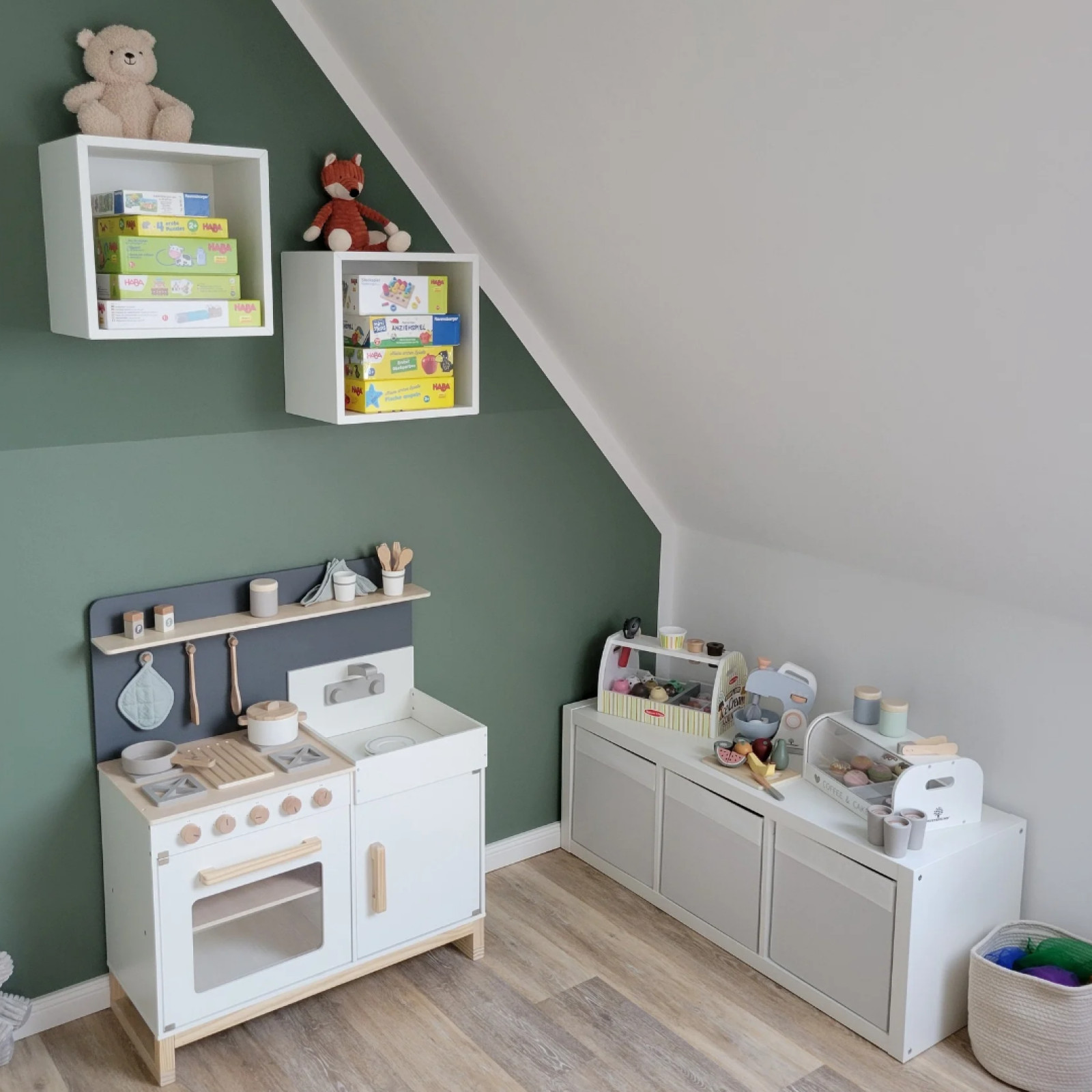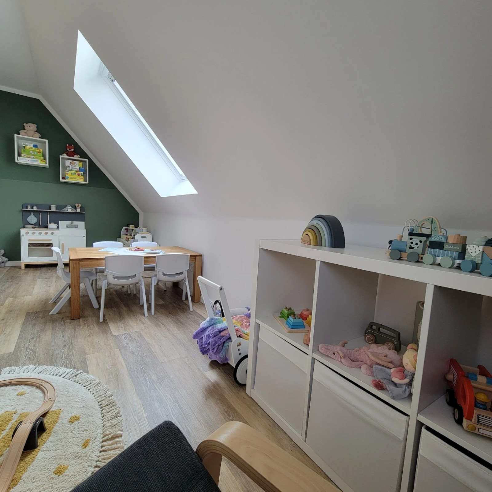 Betreten wird meine Kindertagespflege durch den Hauswirtschaftsraum. Durch die Zwischentür zum Rest des Hauses ist ein entspanntes Ankommen möglich. Während der Bringzeit und für die Mahlzeiten halten wir uns im Erdgeschoß auf. Hier befindet sich das Wohnzimmer mit offener Küche und Essbereich mit einer Größe von etwa 40 qm, davon stehen etwa 24 qm der Kindertagespflege zur Verfügung. Der großzügige Eingangsbereich (Flur) mit weiteren 11 qm kann ebenfalls bespielt werden. Im ersten Stock befindet sich das Spielzimmer mit einer Größe von ca. 14 qm. Hier habe ich verschiedene Bereiche für die Kinder geschaffen. Es gibt zwei Spielbereiche, eine Leseecke, einen Ruhebereich und einen Tisch fürs Kreative. Der Raum wird auch für den Mittagsschlaf genutzt. Die übrigen Zimmer im ersten Stock bleiben verschlossen und die Treppe ist oben wie unten abgesichert. Der Vorgarten mit ca. 75 qm ist eingezäunt und dient allein den Kindern zum Spielen. Hier befinden sich eine große Sandkiste mit Matschküche, ein Balancier- und Bewegungsbereich, ein Spielbereich mit angelegter Straße für Spielautos und eine Baggergrube. Ich habe meine Räumlichkeiten so eingerichtet und ausgestattet, dass ich die Kinder in allen ihren Bildungsinteressen und -bedürfnissen unterstützen kann diese auszuleben.
